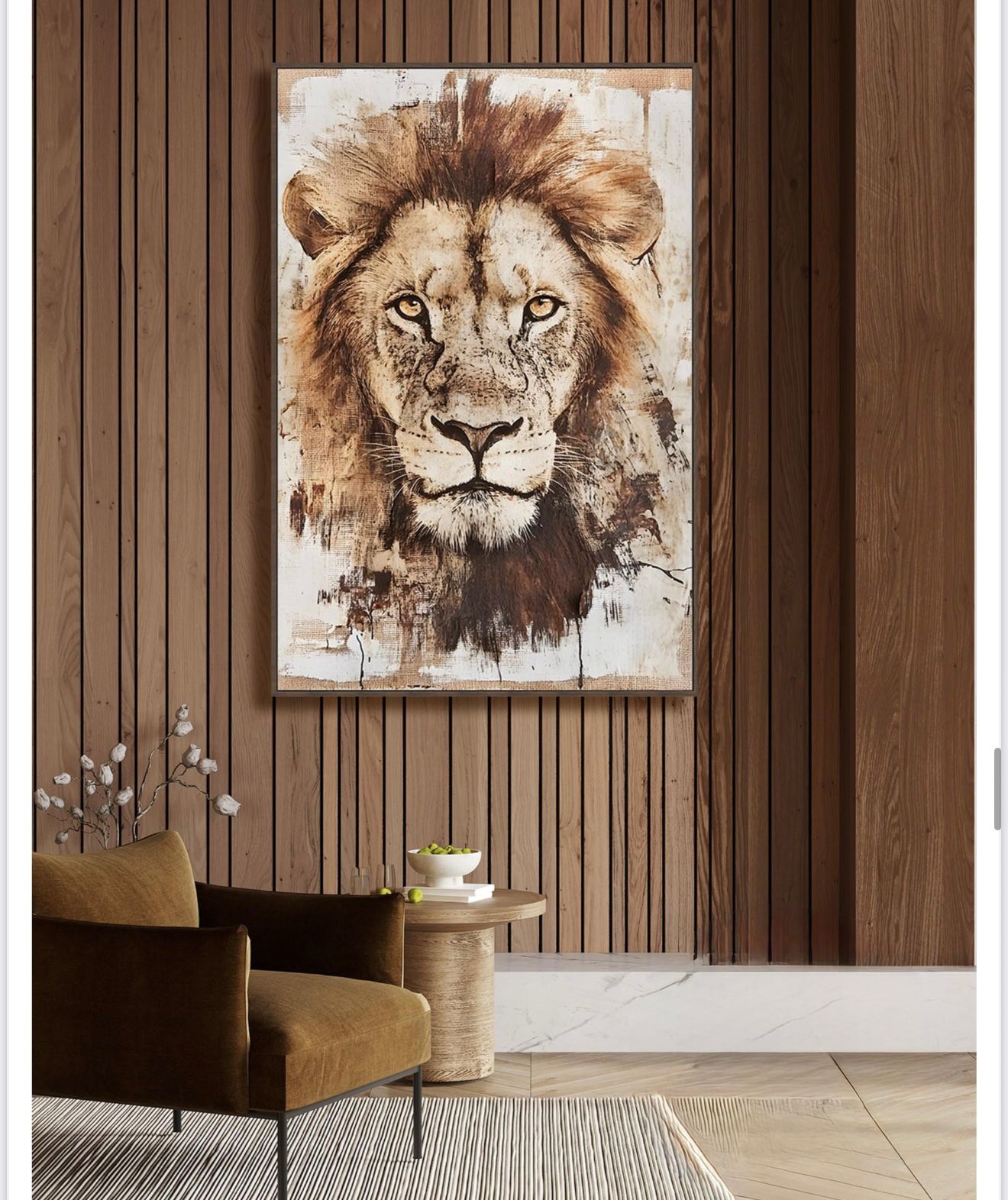 It is the definitive statement piece for clients seeking to infuse their space with bold character, a masculine touch, and a connection to the wild. This painting anchors any room—especially one featuring natural wood and warm tones—with its untamed majesty and powerful presence.”
