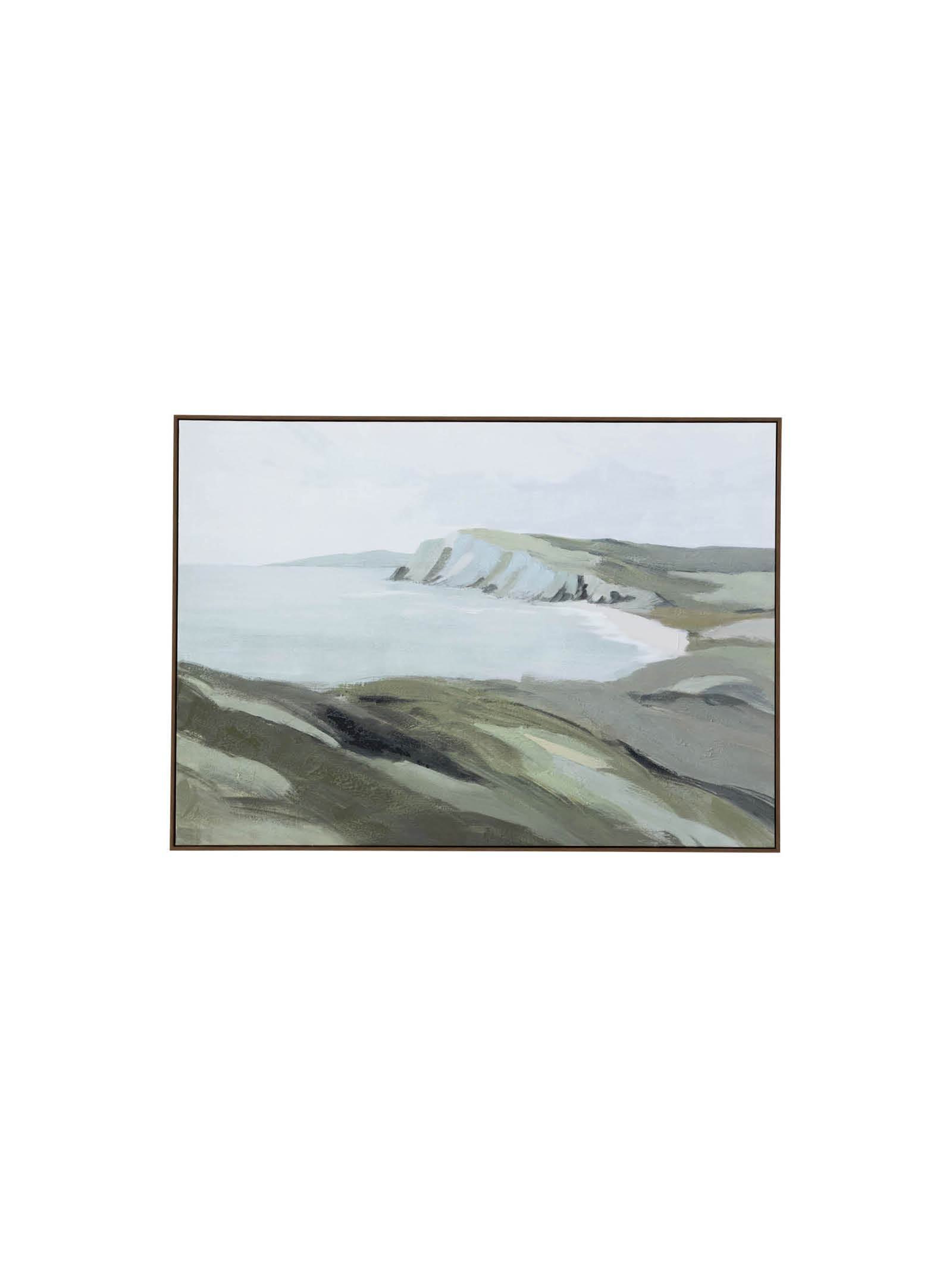 Finished with a premium hand-painted application, Cliffhaven art presents a sweeping coastal landscape viewed from a cliffside. A desaturated palette of muted greys and greens evokes a sense of weathered beauty.