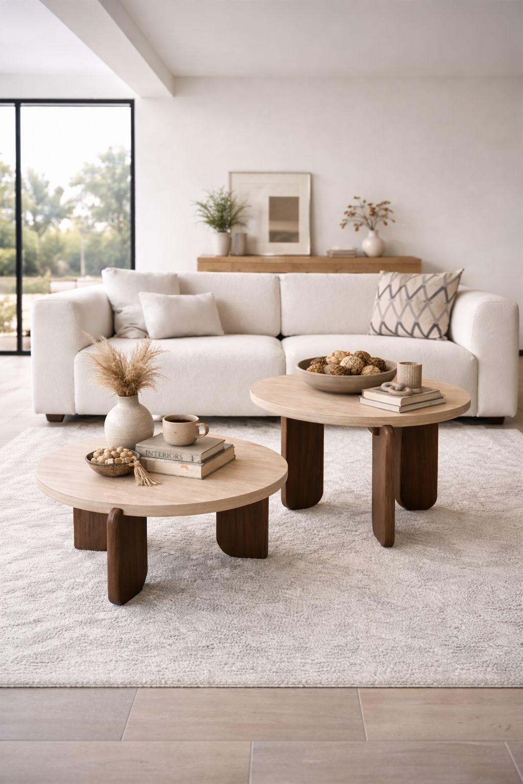 Earthy elegance in natural stone. The cool travertine stone tops sit upon bold, sculpted dark wood legs. These two nesting tables feature clean, organic lines and a grounding mix of heavy stone and light wood.