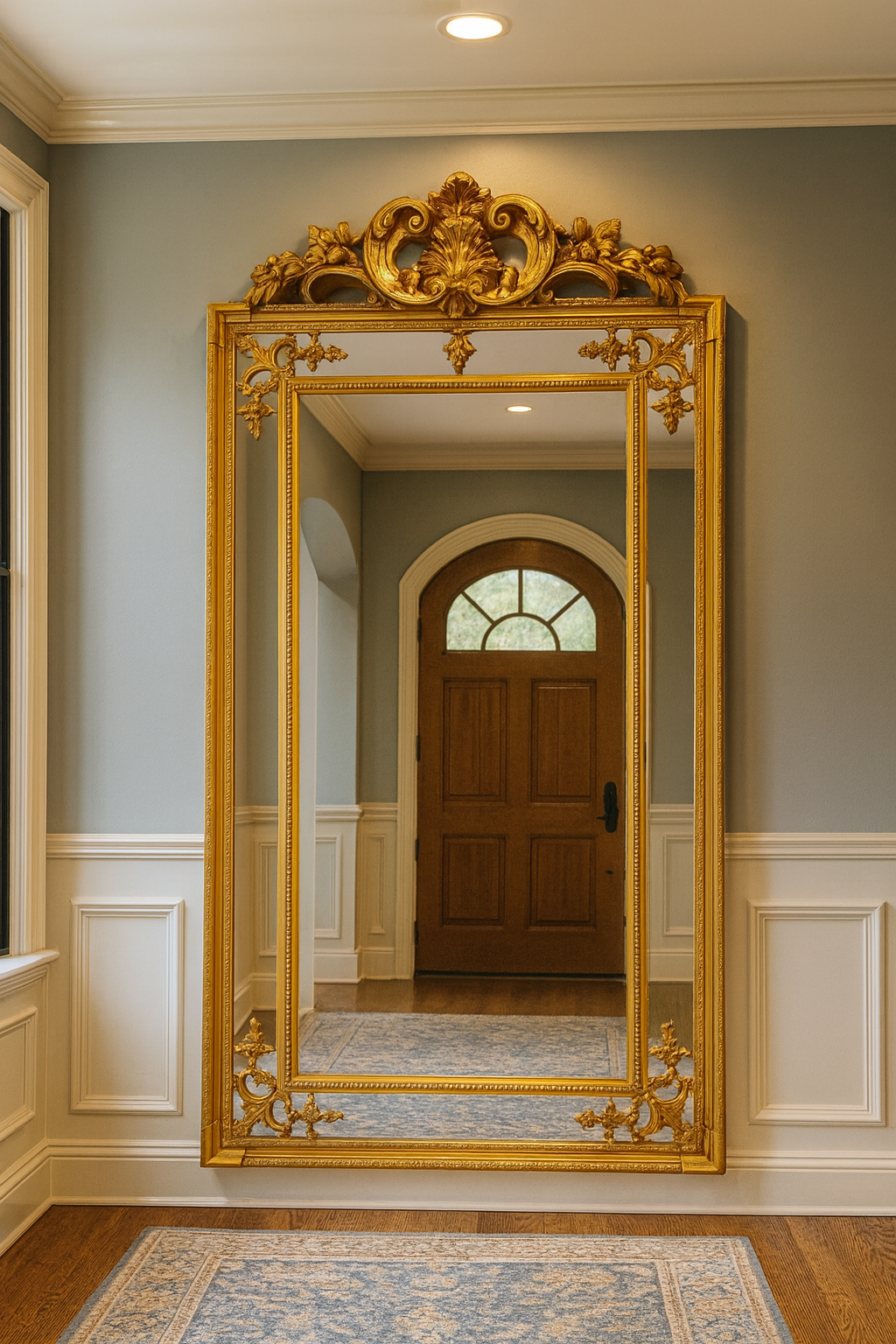This breathtaking mirror commands attention with its generous size and radiant, hand-finished gold leaf frame. Intricate, deeply sculpted Baroque carvings adorn the stately crest and delicate corner details, transforming a simple reflection into a work of art.