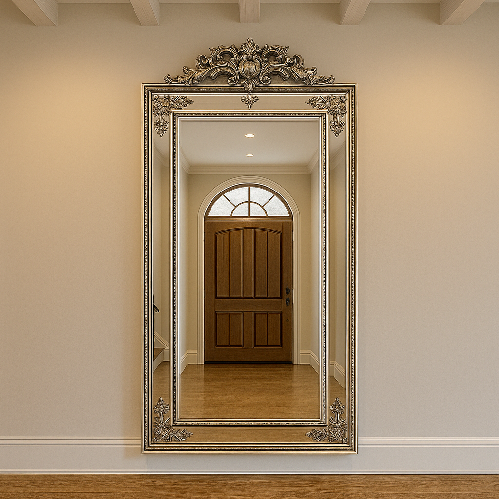 More than a reflection, this mirror is an architectural statement. It features an oversized silhouette framed by a substantial, hand-finished molding in a rich, aged silver or champagne tone. Intricate floral and scrolling carvings grace the crest and corners, lending a distinguished, heirloom quality.