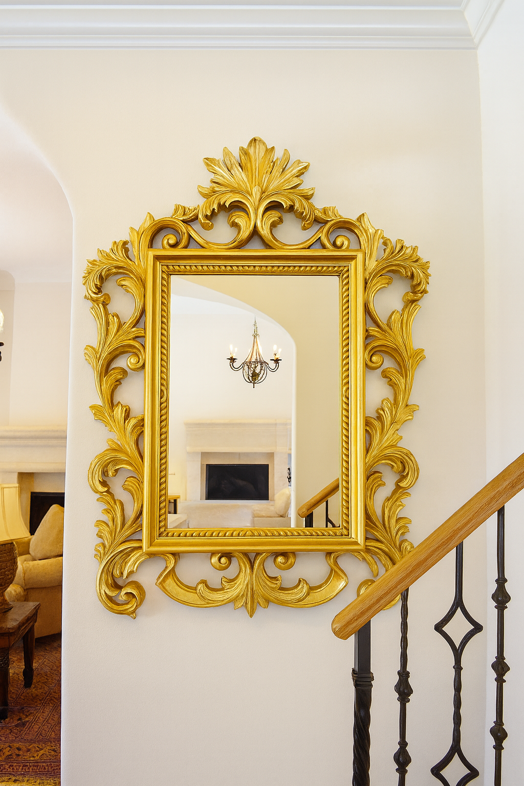 This extraordinary piece is defined by its richly textured, hand-finished gold frame, featuring extravagant, organic scrollwork and a commanding crest detail. It captures the spirit of classic European luxury and transforms it into a vibrant focal point.
