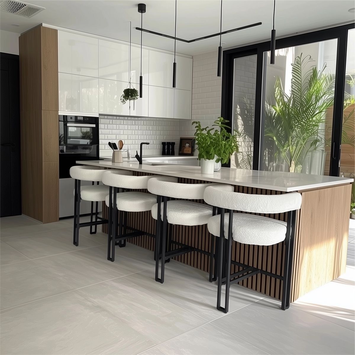 Bring the airy feeling of a boutique lounge into your morning routine. The Cloud barstools feature a plush, bouclé-inspired upholstery and a curved backrest that hugs you just right. Set against architectural black metal legs, they provide a striking contrast to the warmth of wood cabinetry. It’s the perfect seat for slow espressos and long midnight conversations.