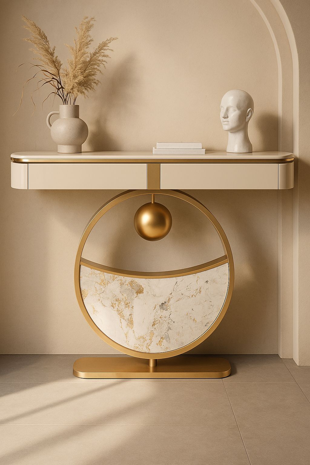 Mid-century spirit meets future-forward shine. The round, black-and-white marble-effect top is held by a wide, mirrored conical chrome base. Its low-profile, dramatic form is a bold, futuristic centrepiece for a chic lounge area.