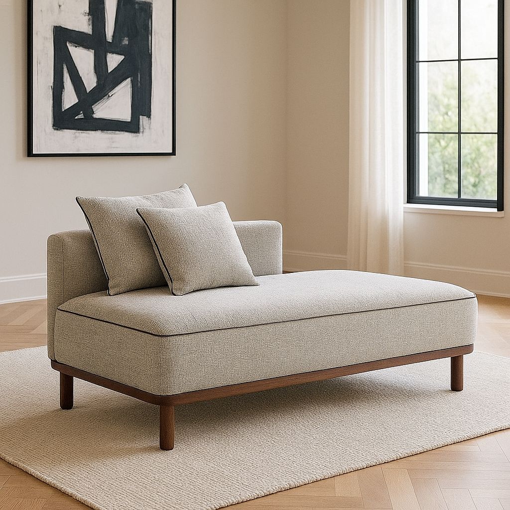 Your private spot for quiet contemplation. This low, clean-lined chaise features a simple walnut wood frame supporting a linen-look cushion with tailored piping. It’s the perfect blend of mid-century form and plush, inviting comfort.