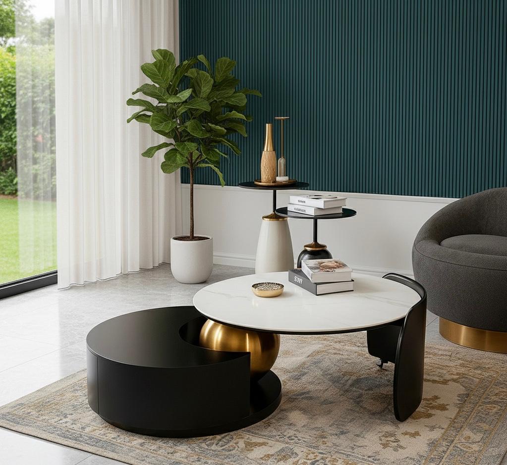 Modern minimalism with a playful secret. The crisp white marble top effortlessly swivels out from the solid, matte black base. The hidden brass sphere adds a warm, luxe detail, making it a functional piece of modern sculpture that adapts to your needs.