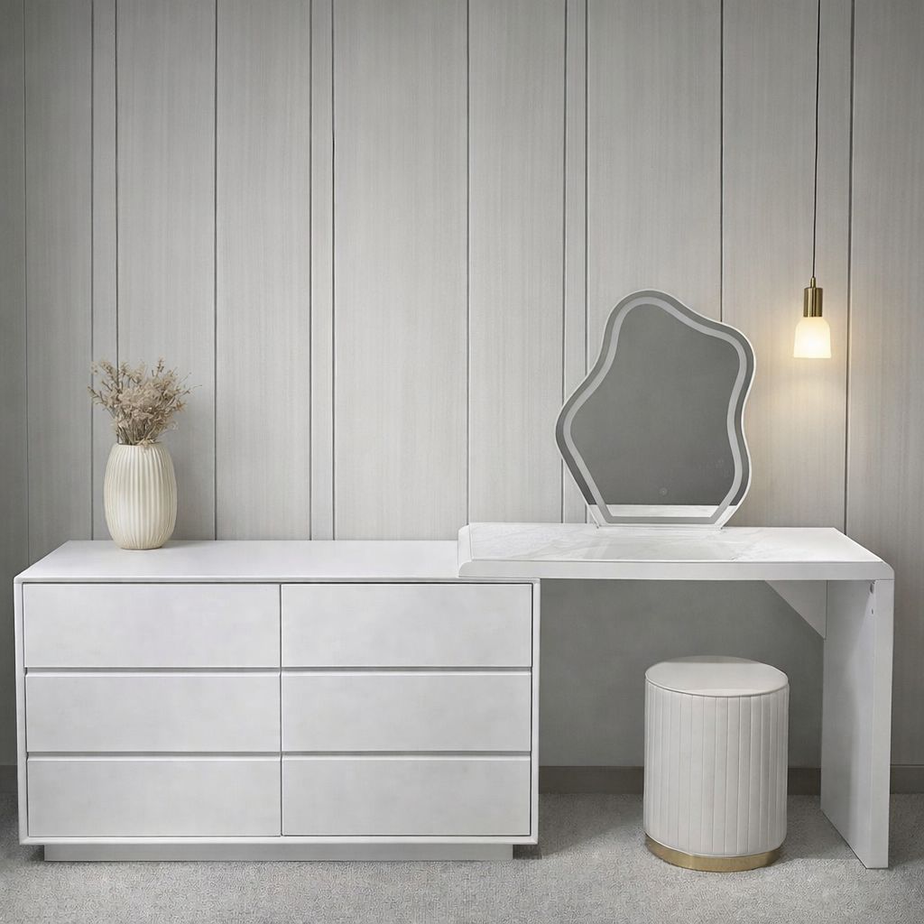 A masterpiece of functional art, this set celebrates the beauty of asymmetry. The stark white, six-drawer dresser offers ample storage, while the overlapping vanity table creates a light, airy workspace featuring a unique, organic-shaped LED mirror. It’s a clean slate for your morning ritual, bringing a sense of calm and modern poeticism to your dressing area.