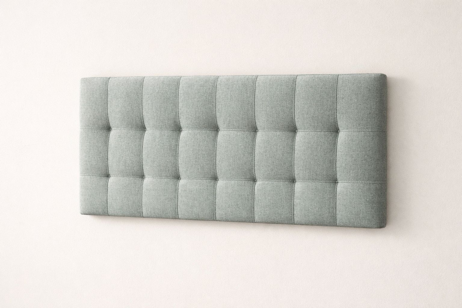 Refers to the horizontal sage/grey tufted rectangular headboard.