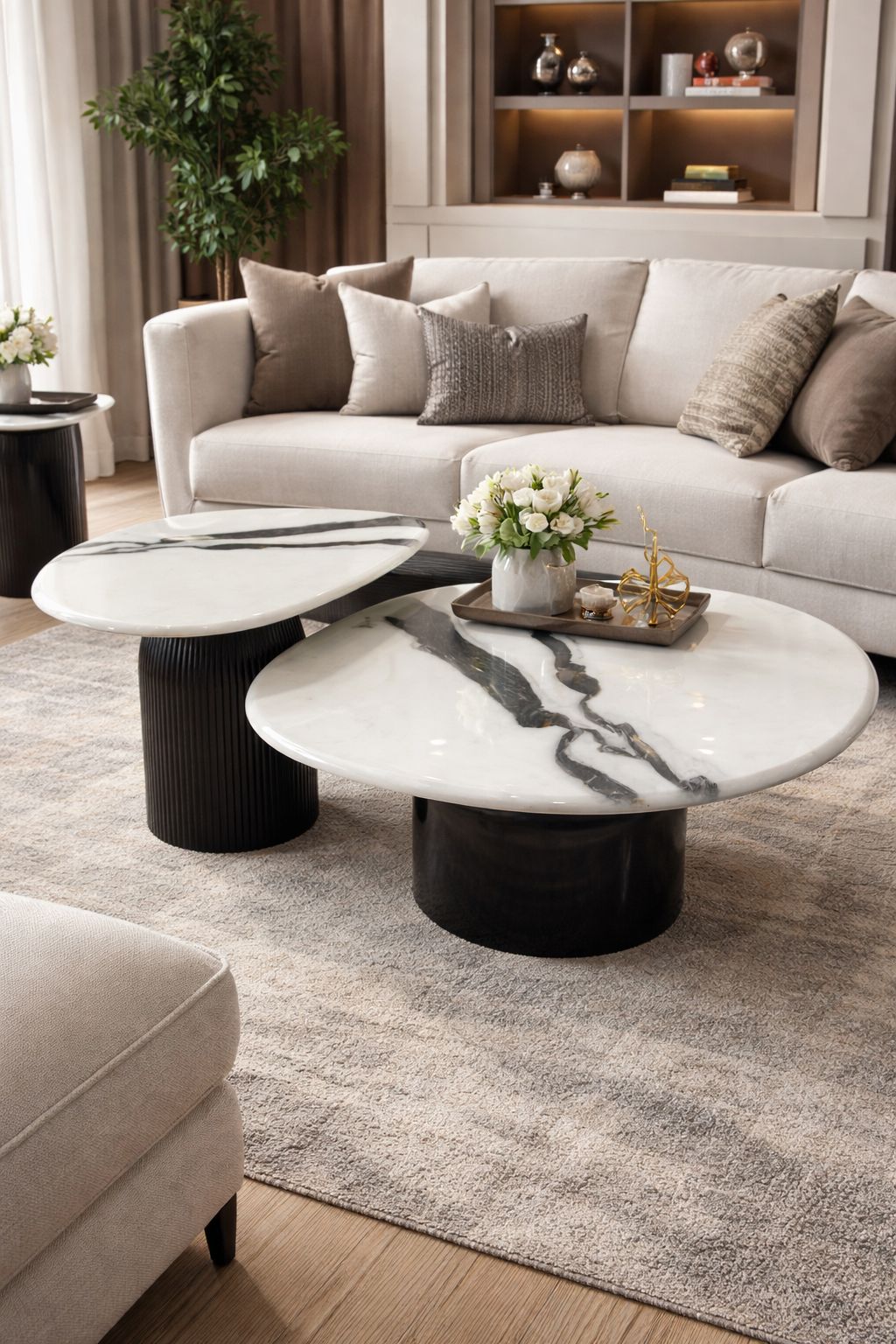 Nature isn’t perfect, and that’s where the beauty lies. The River’s Edge Trio celebrates organic movement with its fluid, pebble-shaped marble tops. The striking black veining mimics the path of a mountain stream, resting atop fluted, obsidian bases. Whether nested together or pulled apart to hold a bouquet of fresh peonies, these tables bring an effortless, sculptural elegance to your living sanctuary.