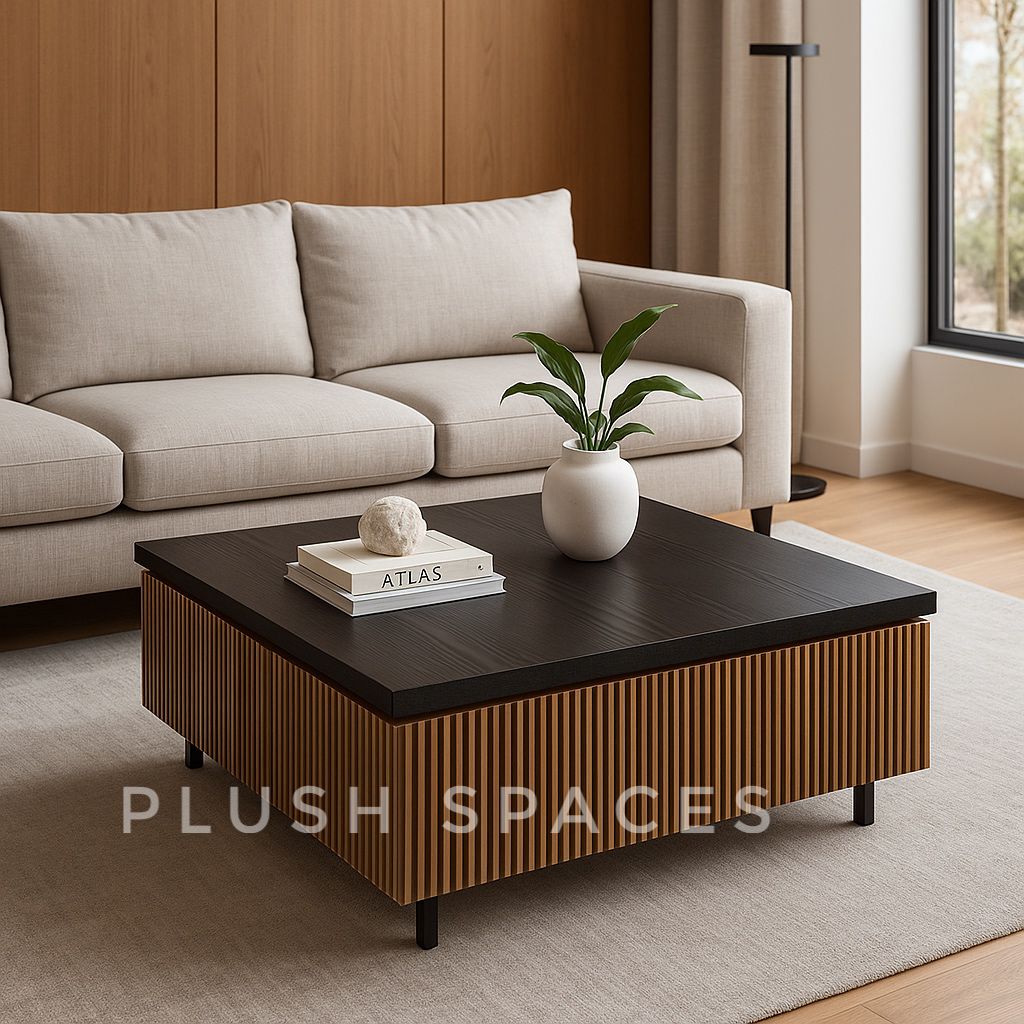 This captivating piece is a study in contrasting harmony, marrying the depth of dark wood with the inviting rhythm of natural elements. Its generous square top, finished in a rich, dark wenge-inspired wood grain, offers a bold, grounding presence, inviting you to gather around.