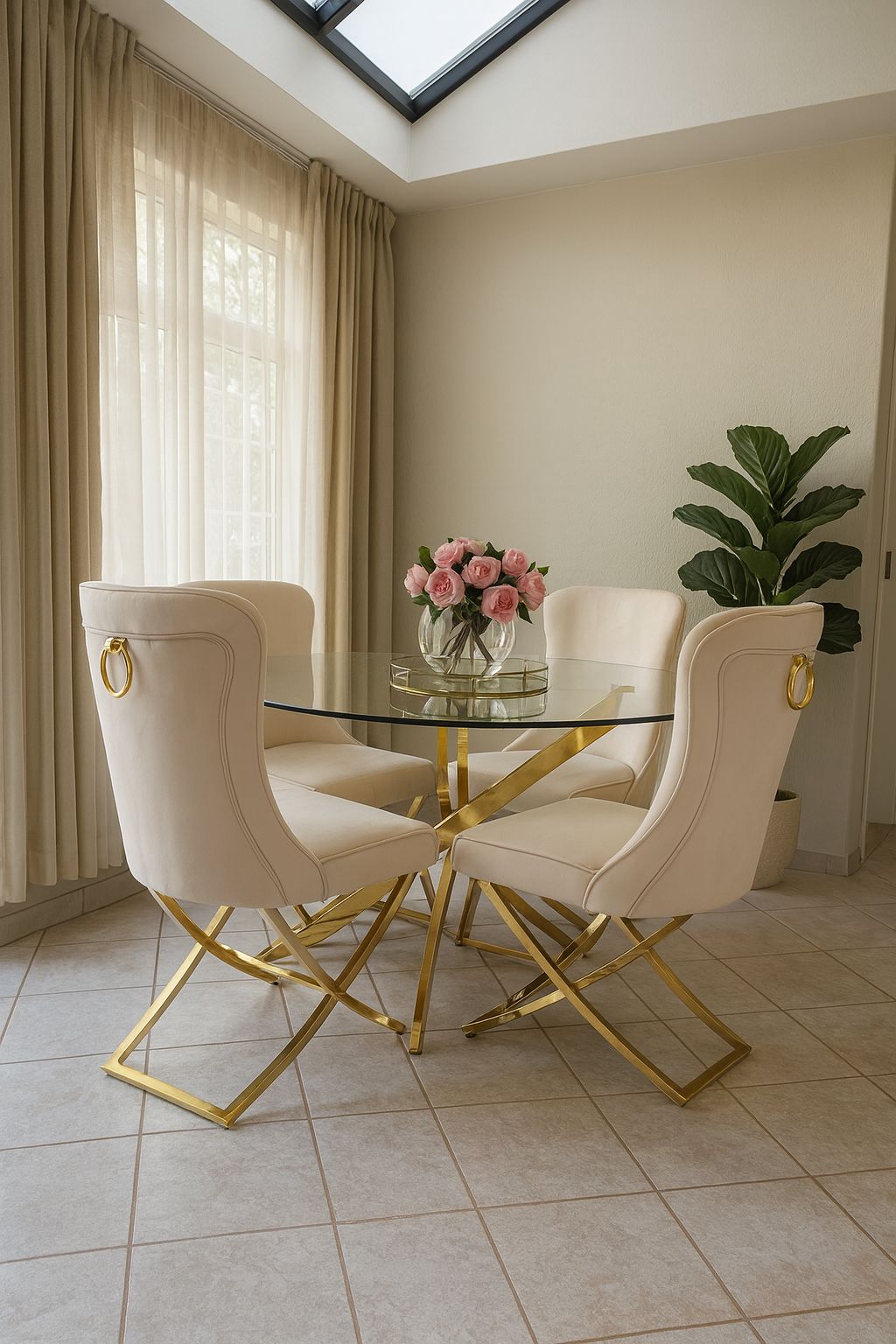 The table features a graceful, round glass top that allows light to pour through, resting on a striking four-way gold-toned base. This foundation creates a dynamic X-pattern, giving the set a weightless, glamorous feel.