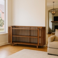 Airy display with a mid-century twist. The entire perimeter is wrapped in vertical wood slats, creating an airy sense of enclosure while keeping books and decor visible. It provides textured elegance and functional open storage.
