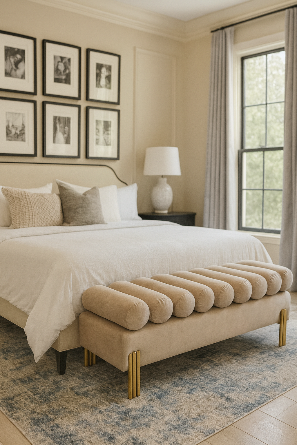 A luxurious invitation to pause. This chic bench features a singular, plush roll-tufted design in a dreamy oatmeal velvet. Supported by delicate, tapering brass legs, it offers a refined yet wonderfully intimate texture for an entryway or the foot of a bed. Settle in, even if just for a moment.